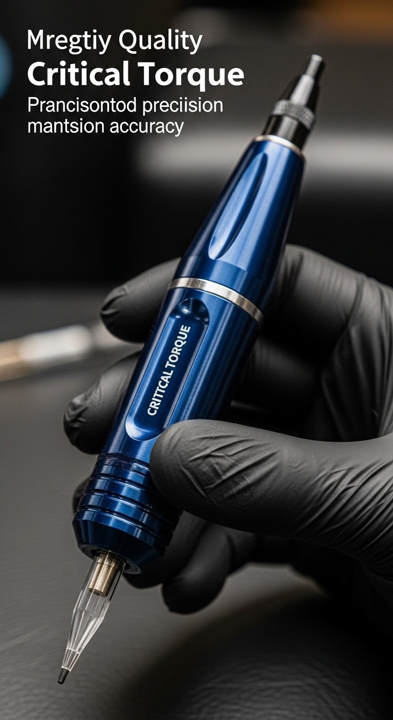 A flowing forearm sleeve that blends a stylized torque pen at its core with mechanical filigree, precision gears, and soft organic elements like ink-washed flowers and flowing ribbons of linework; the pen sits along the radius bone as a focal spine, gears radiate outward into fine-dot shading and crisp, accurate lines, symbolizing the marriage of power and precision. Emotionally it represents confidence, endurance, and creative liberation—reassuring the wearer of steady control and reduced strain—best placed on the forearm or along the inner bicep where the machine’s alignment echoes natural anatomy and the artwork reads clearly in motion.