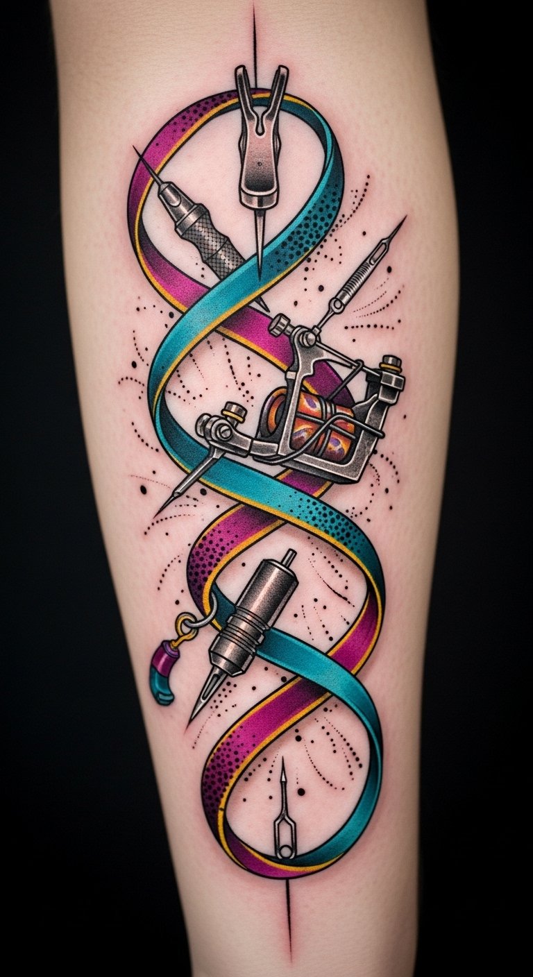 A compact forearm or calf piece that blends imagery of a sleek, stylized beginner tattoo machine cradled by an open book of tutorials and a ribbon banner bearing the phrase “release your creativity”; add small icons of ink bottles, needles, and sparkles to convey tools and inspiration. Symbolically this design represents the start of a personal journey—knowledge (the book), reliable tools (machine and supplies), and guidance (tutorials and tips)—while the ribbon affirms the emotional shift toward confidence and artistic freedom. Ideal placement is a visible yet versatile area like the inner forearm, so it can serve as a motivational emblem that grows with the wearer’s skills.