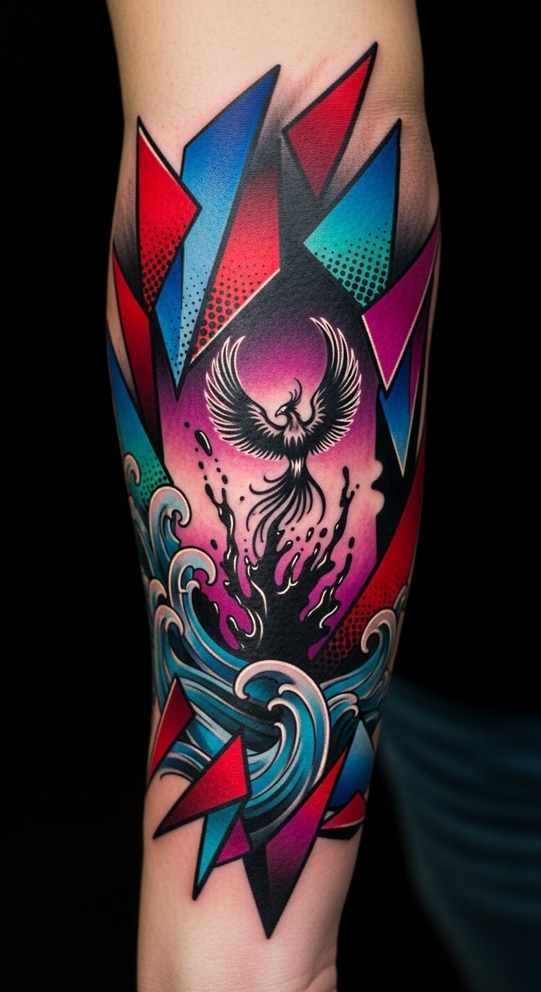 The phoenix symbolizes rebirth and personal transformation, while the geometric shards and organic waves reflect life’s structured challenges and flowing emotions; placement along the forearm allows the piece to move with the wearer, projecting confidence and inviting conversation, with color choices evoking passion, calm, and resilience.