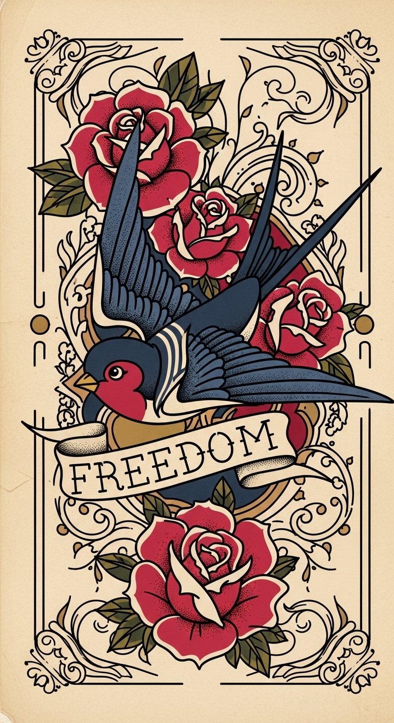 Explore the charm of vintage tattoo ink sets, where classic aesthetics meet timeless artistry. These sets invite you to embrace vintage tattoo styles, celebrating the intricate details and bold lines of a bygone era. With classic ink techniques, you’ll release your creativity and craft pieces that resonate with history, freedom, and individuality. Plunge into the past and let your artistry flourish! This design juxtaposes the sailor swallow and banner to symbolize journey and liberty, roses for love and remembrance, and filigree to evoke ornate tradition; emotion leans nostalgic and empowering. Ideal placement: upper arm or chest as a bold flash-style statement piece that reads well from a distance.