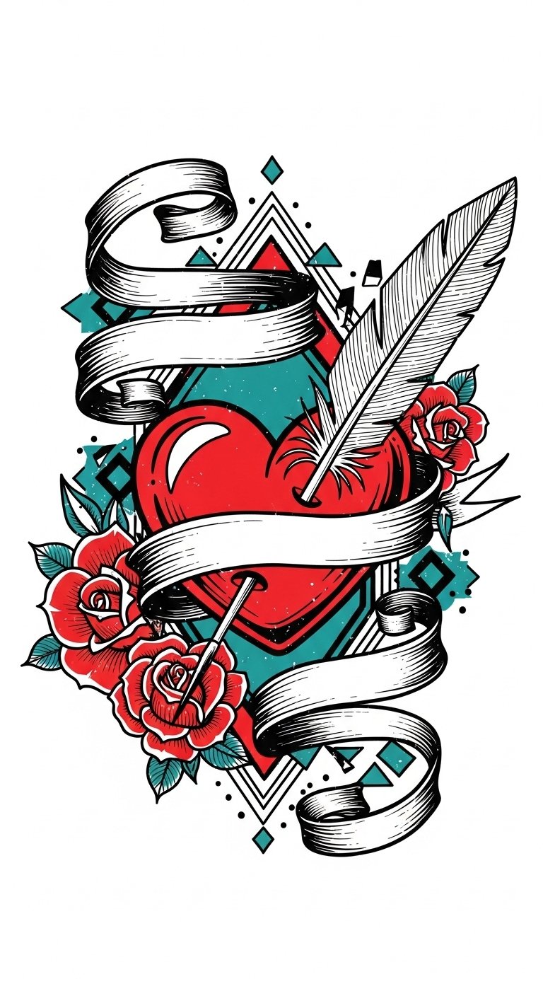 The pierced heart with the quill symbolizes a love for body art and creative expression. The banner ribbons evoke personal statements or mottos to be added by the wearer. Roses bring passion and timeless beauty while geometric accents represent modern streetwear edge.