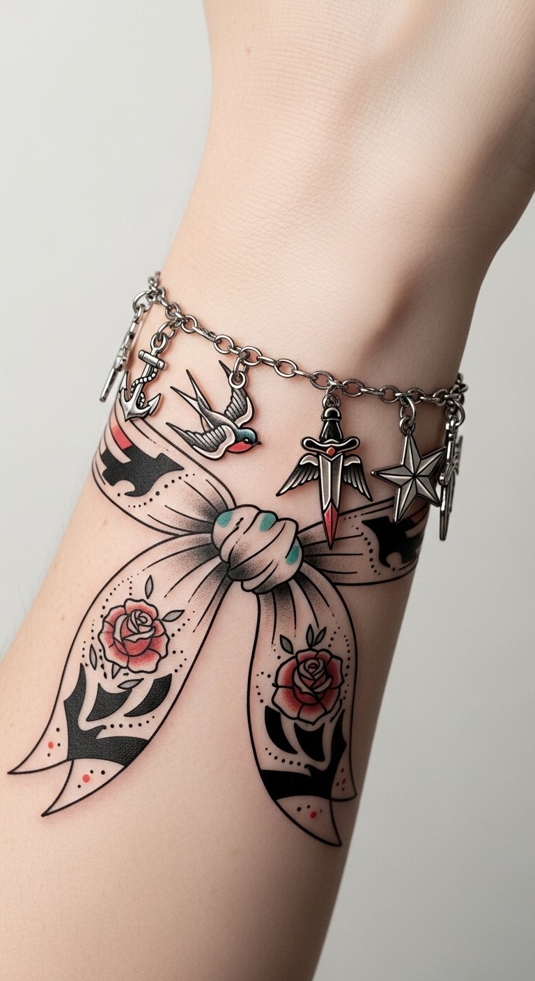 The design symbolizes a bridge between jewelry and tattooing—each charm holds personal meaning (protection, love, journey), the scarf motif evokes movement and storytelling; emotionally it feels intimate and celebratory, suited for wrist or forearm placement where both accessory and tattoo-readability are natural and visible.