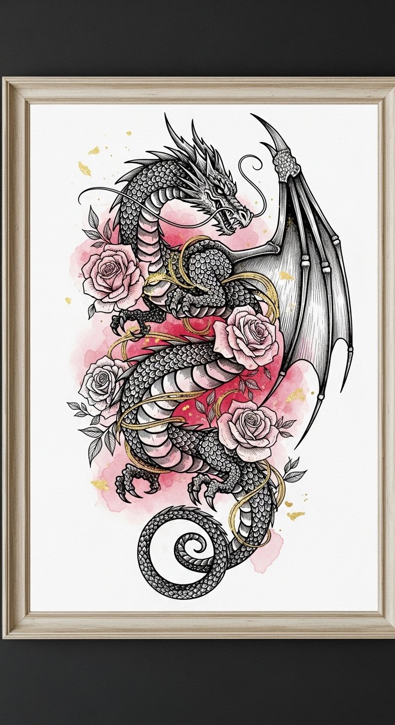 The dragon entwined with roses symbolizes strength tempered by beauty—power and protection softened by love and vulnerability. Emotionally, the piece evokes resilience, pride, and tenderness, inviting viewers to reflect on personal battles and the gentleness that grounds them.
