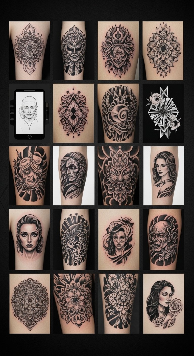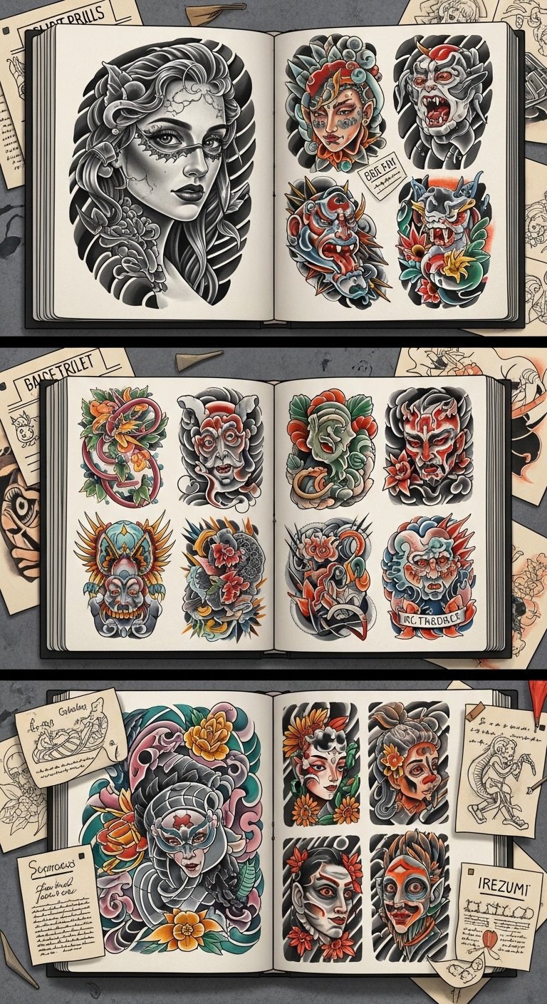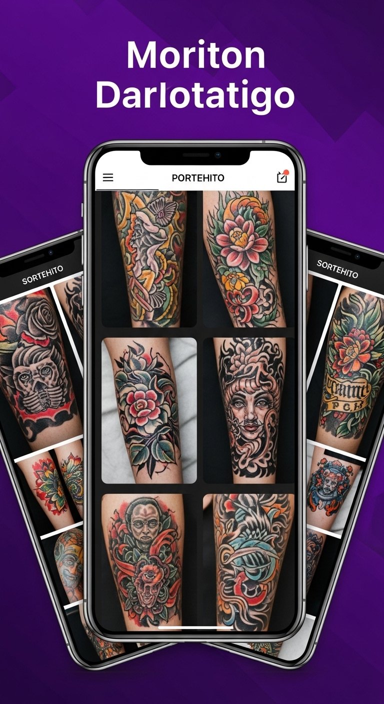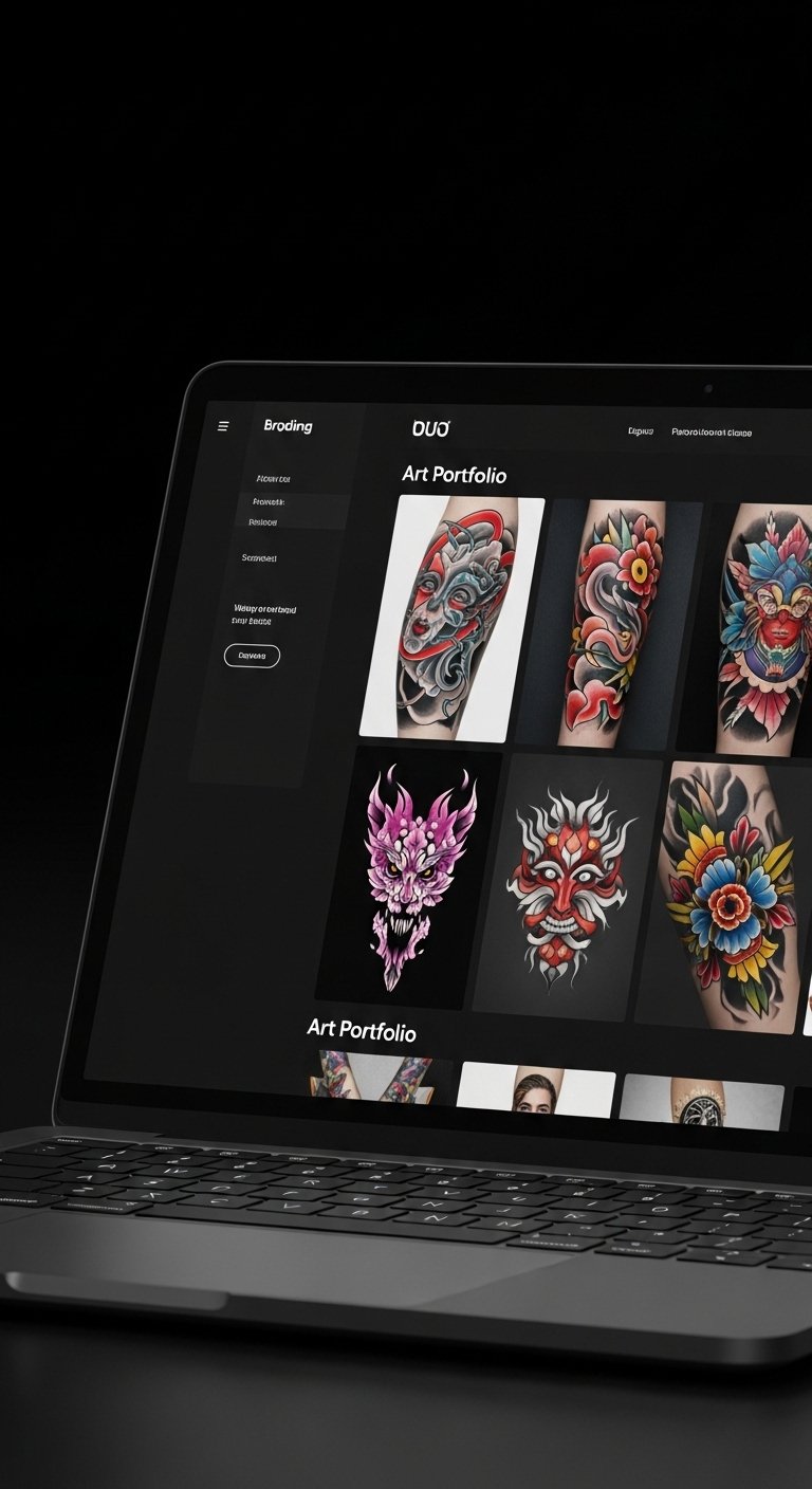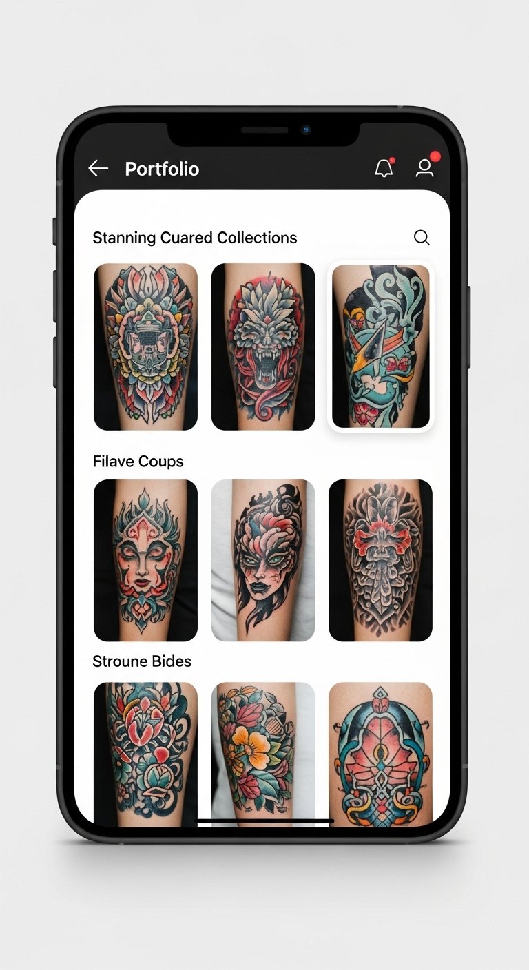 This tattoo concept translates the idea of a digital portfolio into a visual narrative: a stylized open sketchbook with glowing, pixel-like motifs and delicate linework representing diverse tattoo styles emerging from the pages—micro-realism, geometric, floral, and script—connected by flowing circuitry and subtle gradients. Symbolically it celebrates artistic evolution, connection, and individuality; the glowing pixels suggest modern platforms amplifying creativity while the varied motifs honor versatility and curated craft. Emotionally it conveys pride, aspiration, and invitation; ideal placement is a forearm or shoulder blade where the open-page composition can read horizontally and the connective circuitry can flow toward the wrist or spine, allowing the wearer to “showcase” their creative identity.