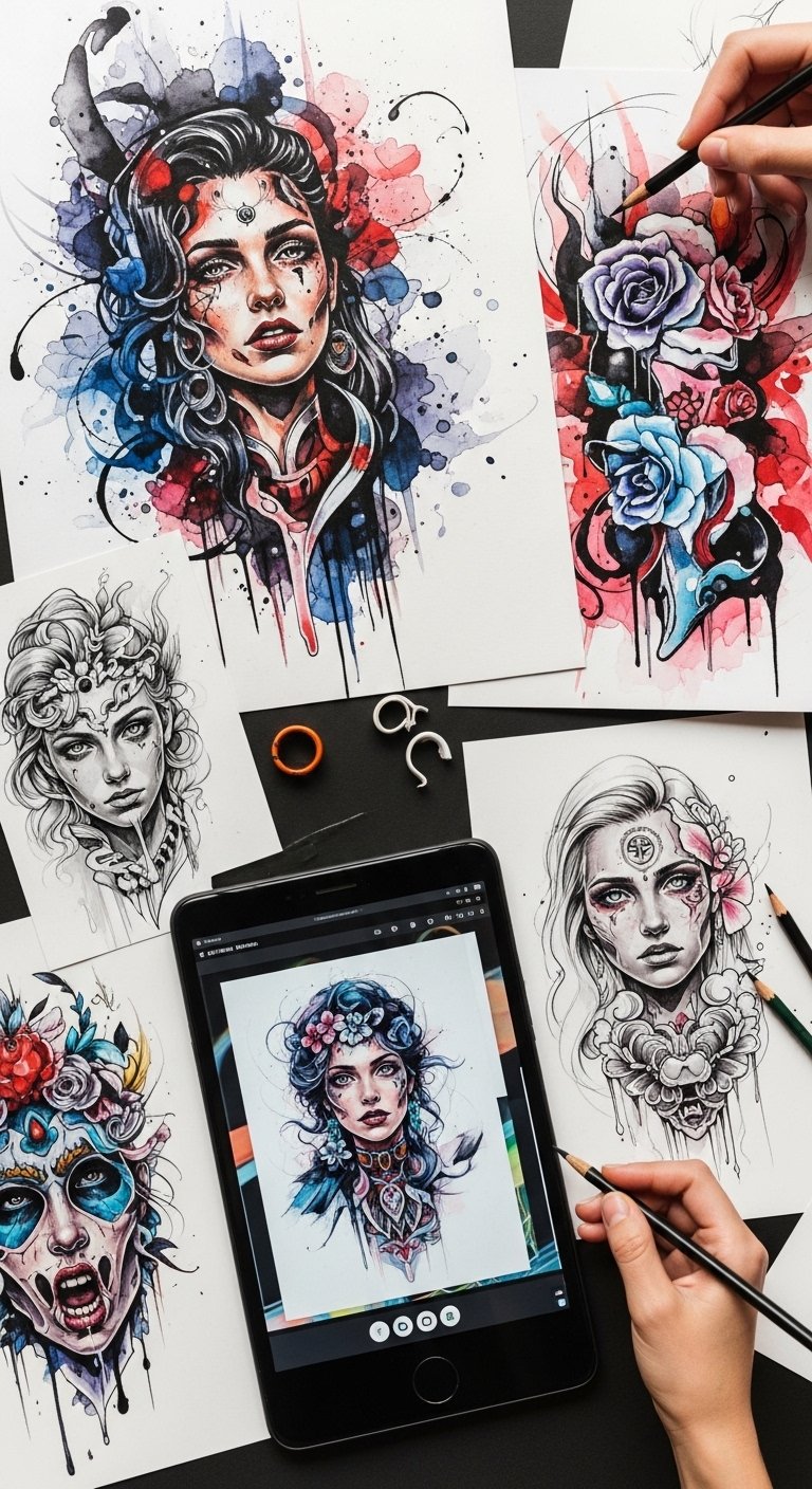 This concept blends watercolor washes, crisp black ink linework, and subtle digital-gloss highlights to symbolize creative evolution and personal transformation; the flowing colors represent emotional depth and freedom, the defined lines anchor identity and intention, and the digital sheen nods to modernity and adaptability. Emotionally it evokes confidence and individuality—ideal for a client seeking a statement piece that feels both expressive and intentional. Placement options: upper arm for a visible, wraparound composition; back shoulder for a larger, immersive canvas; or forearm for a bold, everyday reminder of artistic growth.
