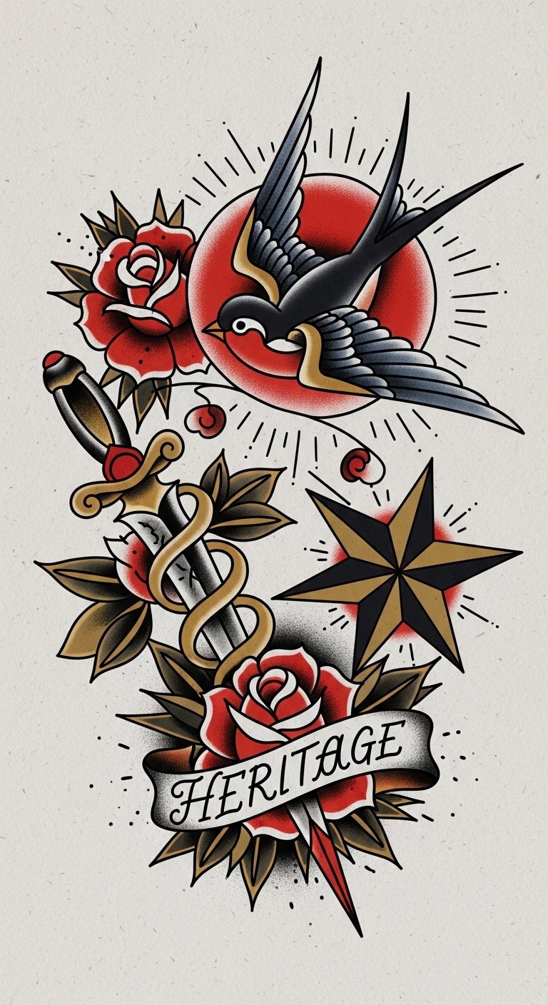 This concept channels the emotional resonance of legacy and liberation through classic iconography—the swallow for safe return and freedom, the dagger and rose for the duality of pain and beauty, the nautical star as guidance, and the banner naming the connection to tradition.