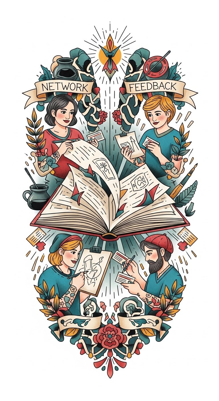This design symbolizes the journey from solitary practice to communal growth: the open sketchbook represents readiness and the “compelling portfolio” as a talisman, the lamplit artist conveys dedication and late-hour refinement, and the exchanged scroll signifies mentorship and shared knowledge.