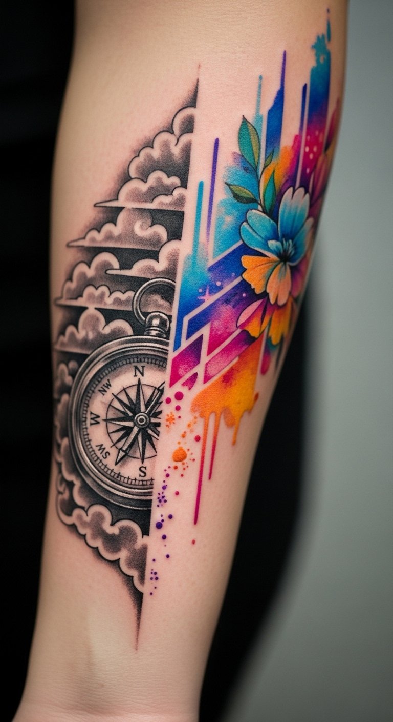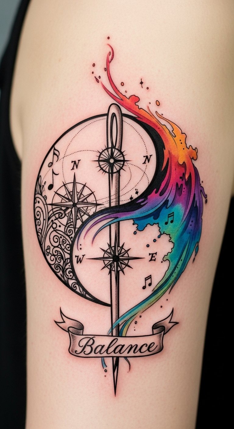 As you explore deeper into the world of tattoo artistry, the choice between specialization and versatility becomes increasingly significant. Embracing niche artistry can refine your personal style, aligning with market demand and client preferences. However, cultivating broad appeal through versatility fosters artistic growth, allowing you to adapt to industry trends. Ultimately, find a balance that fuels your creative focus and satisfies your artistic soul. This design symbolizes the duality of focused mastery and adaptable creativity: the geometric needle represents precision, discipline, and a specialized path, while the watercolor brushstroke embodies fluidity, exploration, and varied influences. The compass points suggest direction and career choices; musical notes and negative space hint at personal expression and subtlety. Emotionally, it conveys harmony and intentional choice rather than conflict. Recommended placement is the forearm for visibility and conversational impact, or the upper back for a larger canvas that allows the watercolor to flow and the geometric details to hold crispness.