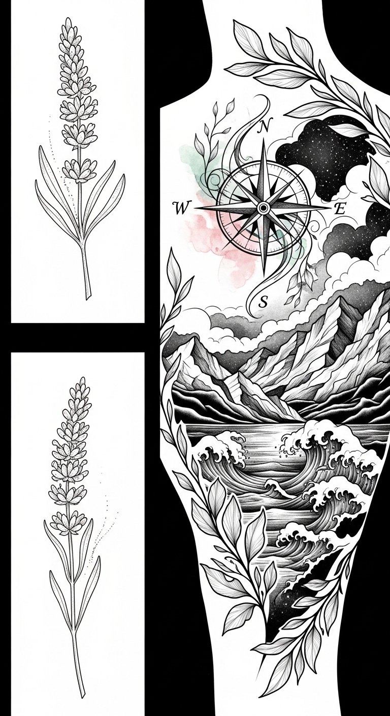 This triptych concept uses scale to express a personal narrative: the lavender sprig symbolizes quiet resilience and intimate memories; the compass rose represents exploration, decision, and guidance in life’s transitions; the expansive landscape embodies growth, aspiration, and the unfolding of one’s story.