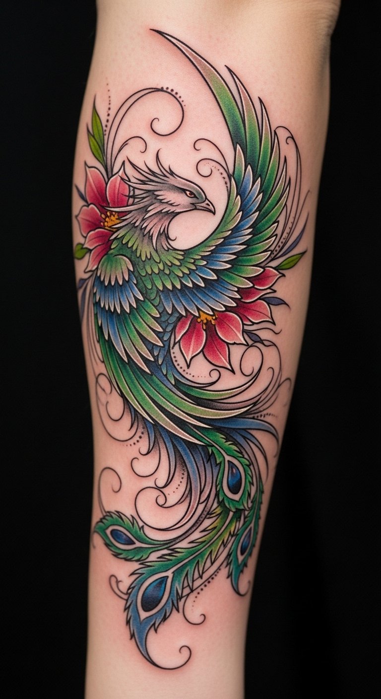 A tattoo design that fuses a vintage quill and an illuminated circuit board into a flowing sleeve or upper back piece, with delicate gallery frames, tiny mobile screens, and a rising phoenix composed of brushstrokes and pixel fragments; use fine-line detail, soft watercolor washes, and bold geometric connectors to convey harmony between craft and technology. This piece symbolizes the evolution of artistic identity—honoring traditional skill while embracing modern presentation—evoking pride, ambition, and creative reinvention; placement along the arm or across the shoulder blade allows the imagery to lead the eye upward, suggesting growth and expanding audience reach.
