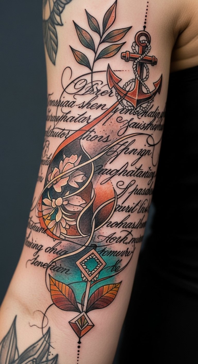 Toile design concept: a flowing half-sleeve that repeats a select color palette (muted teal, deep ochre, warm sepia) and a signature line style—fine, slightly textured lines with selective bold anchors—to link distinct elements: a stylized compass, layered botanical silhouettes, and abstract wave motifs. Symbolically, the compass represents direction and artistic intent, the botanicals growth and continuity, and waves emotional flow; together they express a steady, evolving creative identity. Emotionally the piece balances calm confidence with approachable warmth. Ideal placement is outer upper arm wrapping toward the shoulder, allowing motifs to read as a unified narrative or be viewed as smaller vignettes when desired.