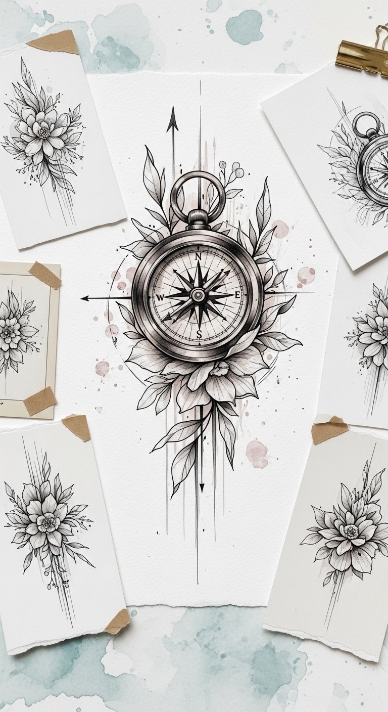 This design symbolizes guidance (compass) and growth (botanical elements) intertwined with the creative process (sketches and clippings), evoking introspection, clarity, and confidence; it would sit well on the inner forearm for a personal daily reminder or across the upper back as a statement of identity.
