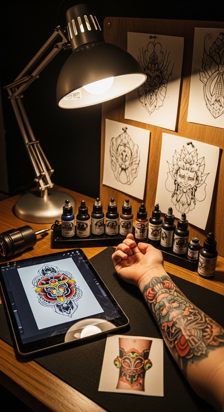 A composition symbolizing dedication to craft and the transformative power of presentation: the vintage workstation evokes tradition, the ordered inks and pinned sketches convey discipline and creative process, while the tablet with color-enhanced artwork and the finished forearm tattoo represent modern tools and tangible outcomes.