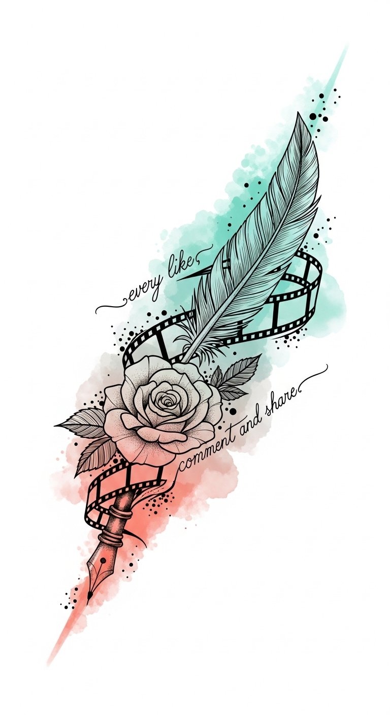 A design that merges tools of creativity and community: the quill represents artistic craft and the act of crafting a portfolio, the rose embodies unique personal style and blossoming recognition, and the film-strip ribbon symbolizes posts, interactions, and storytelling.