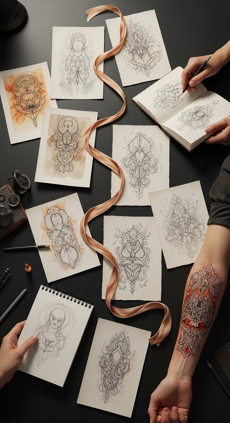 A tattoo concept centered on an open sketchbook with a progression of designs across its pages, from simple linework to full-color realism, interwoven with faint handwritten client notes and small portrait thumbnails; surrounding elements include a compass, fine-liner pens, and subtle watercolor splashes that symbolize growth and experimentation. Symbolizing the artist’s journey and relationship with clients, the piece conveys pride, humility, and ongoing development—ideal for a forearm or upper back placement where the layered narrative can be read in sequence and appreciated up close.