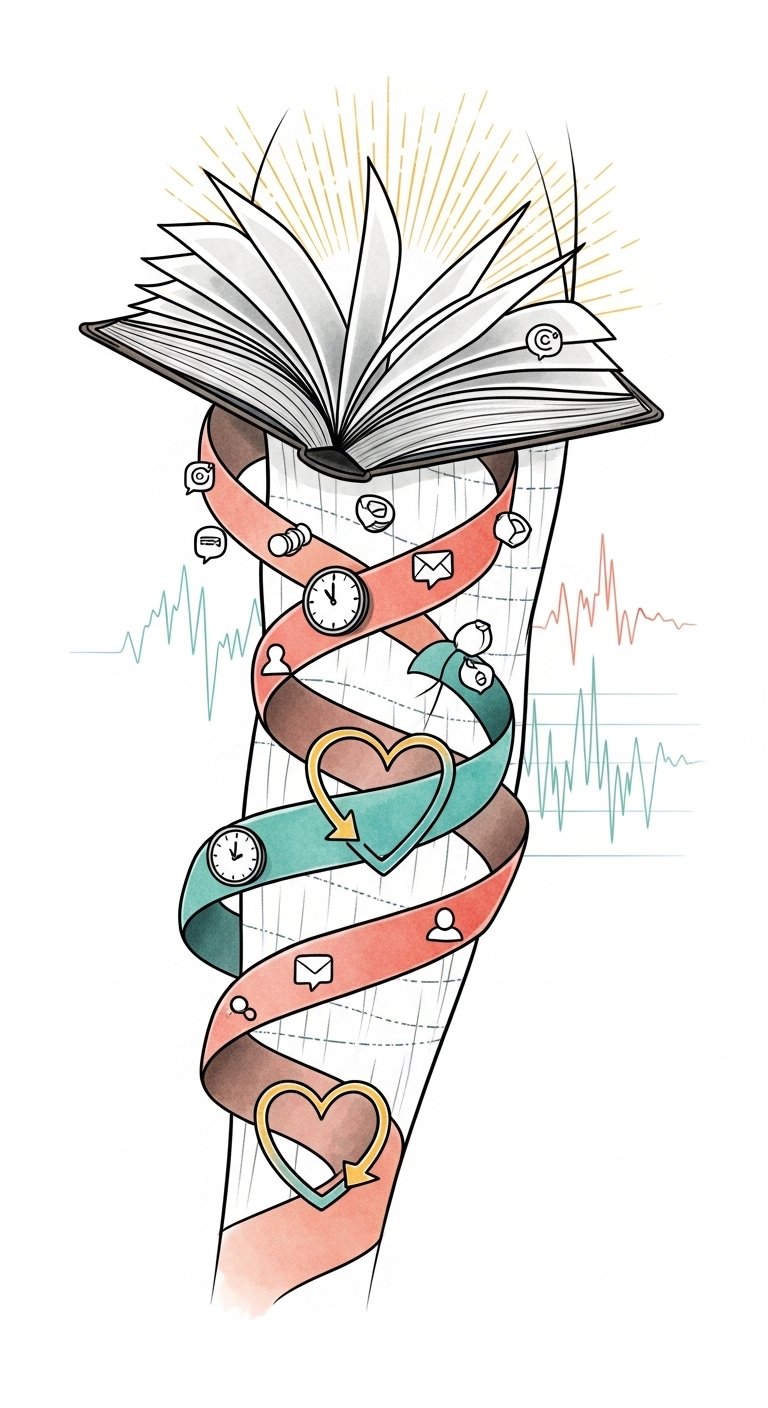 The design symbolizes the fusion of traditional craft and modern connectivity: the open portfolio represents established skill, the digital ribbons and icons convey real-time social engagement, and the clock faces hint at immediacy and timing.