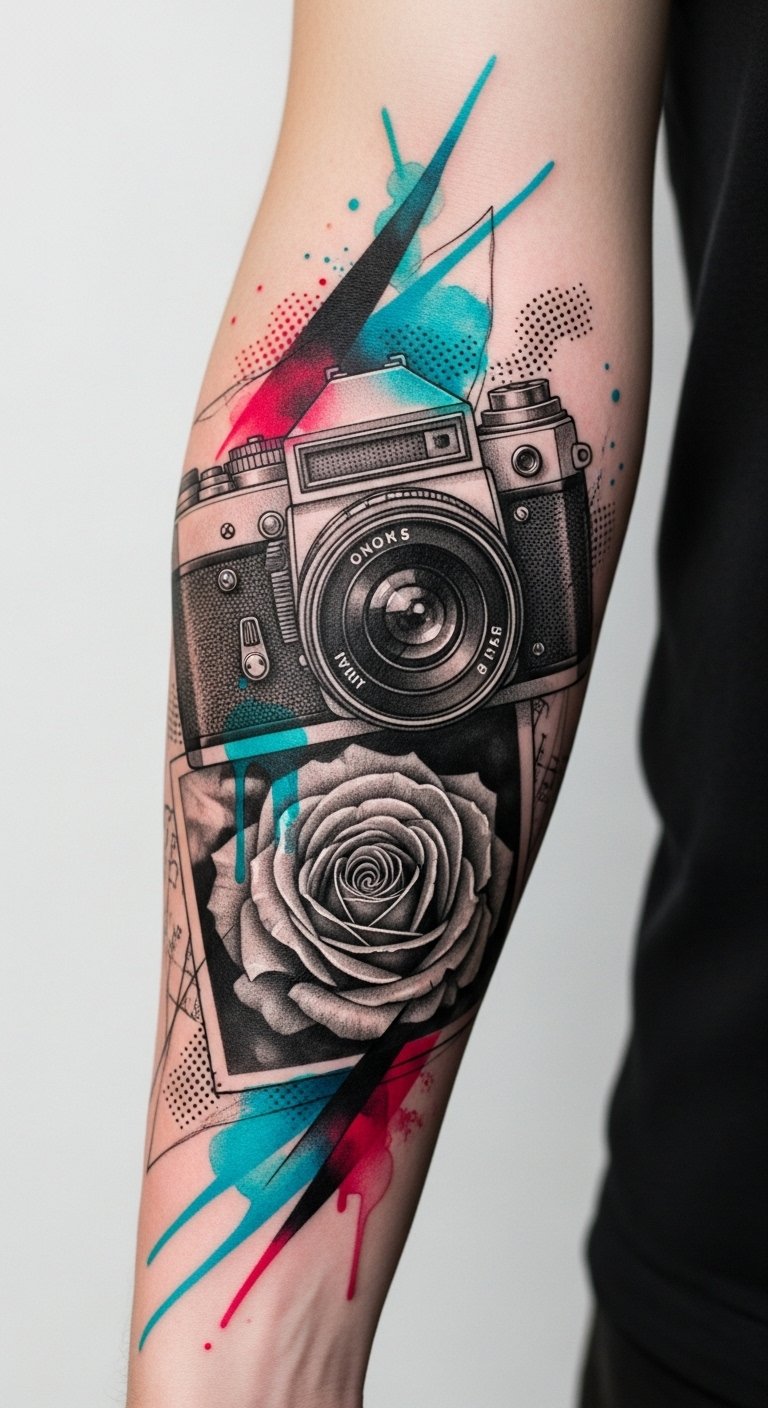 A sleeve design inspired by mobile convention displays: a flowing collage of vibrant color blocks and dynamic geometric layouts interspersed with hyper-detailed miniature tattoo scenes and camera lens motifs, connected by a ribbon of glowing circuitry and stylized hand-drawn arrows; bold contrasts and negative-space cutouts make focal images pop, with occasional splashes of watercolor and stippled texture to mimic printed media.