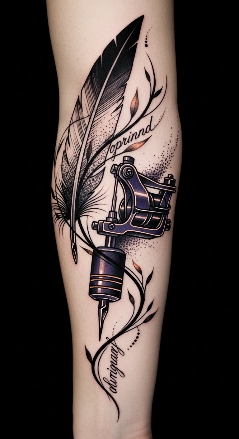 The design marries tools of craft (quill and machine) and organic growth (brushstroke vines) to symbolize artistic evolution and the merging of tradition with contemporary technique. Bold-to-fine transitions convey confidence and precision, while the integrated faint script acts as a hidden personal mantra, visible only on closer inspection—evoking intimacy and authenticity.