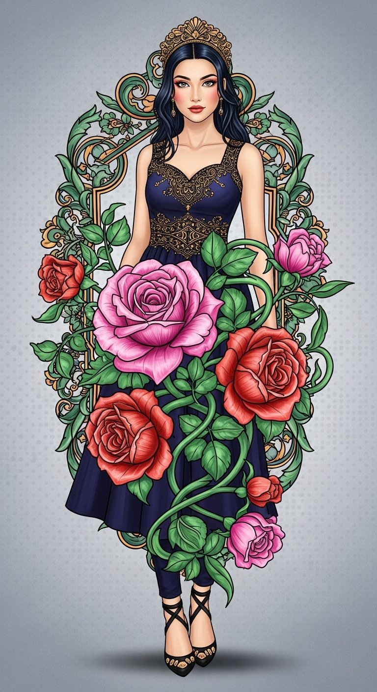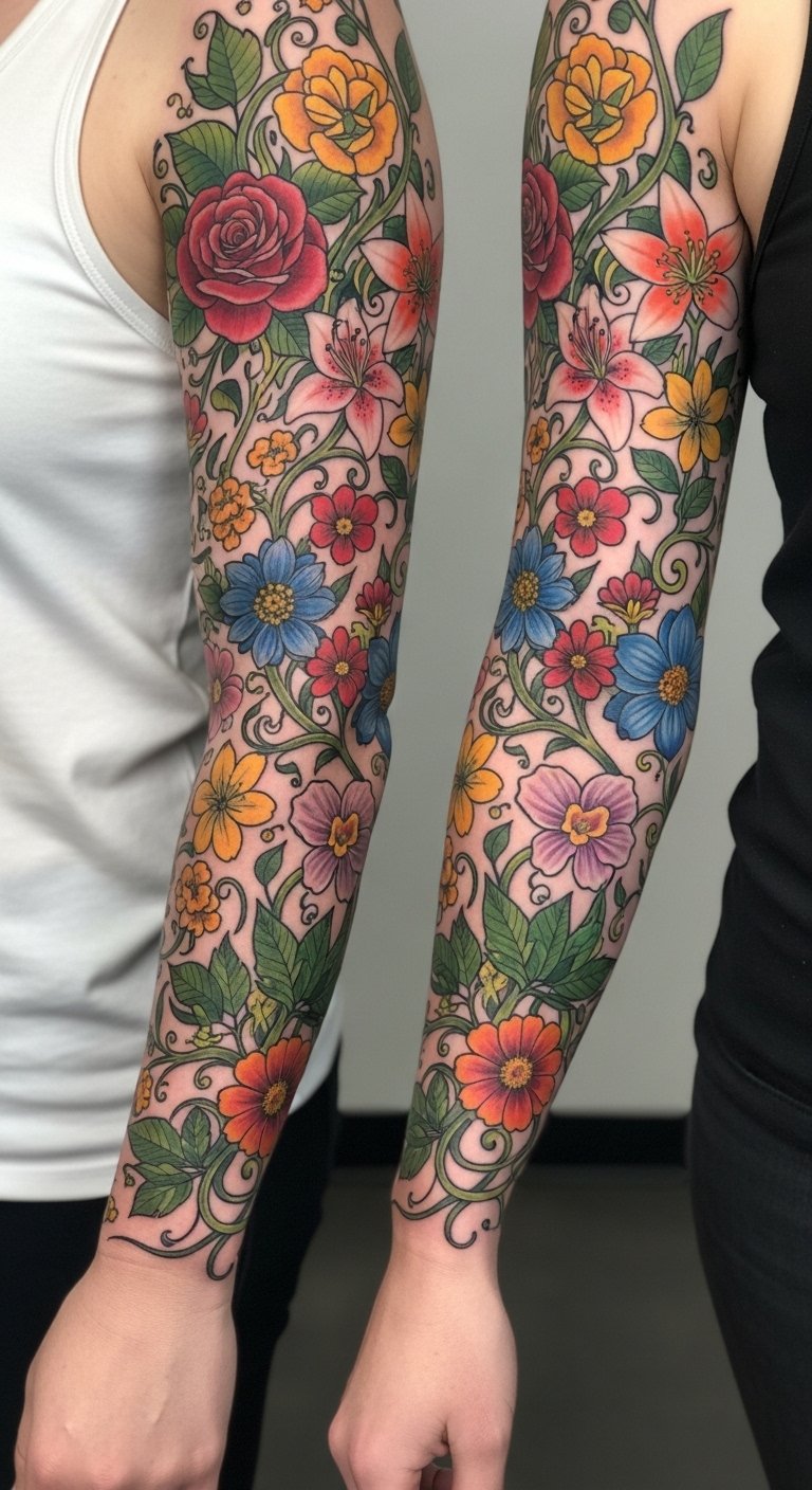 This design symbolizes growth, resilience, and individuality — roses for love and passion, greenery for renewal — evoking joy and empowerment; ideal placement is a full sleeve that flows from shoulder to wrist, allowing the elements to wrap naturally around musculature and joint transitions for continuous movement and visual storytelling.