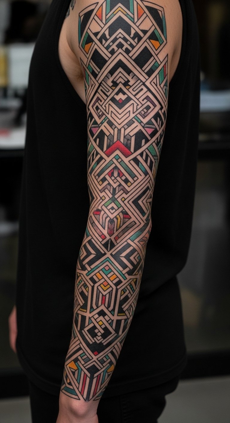 Bold Geometric Patterns here symbolize balance and motion—sharp lines and interlocking shapes represent structure while dynamic contrasts convey personal energy and transformation. Emotionally, the design projects confidence and liberation, a visual manifesto of individuality and creative courage. Ideal placement is a full or half sleeve where the symmetry can wrap the arm, allowing lines to flow with muscle contours and colors to accent movement, making the piece both visually cohesive and intimately expressive.