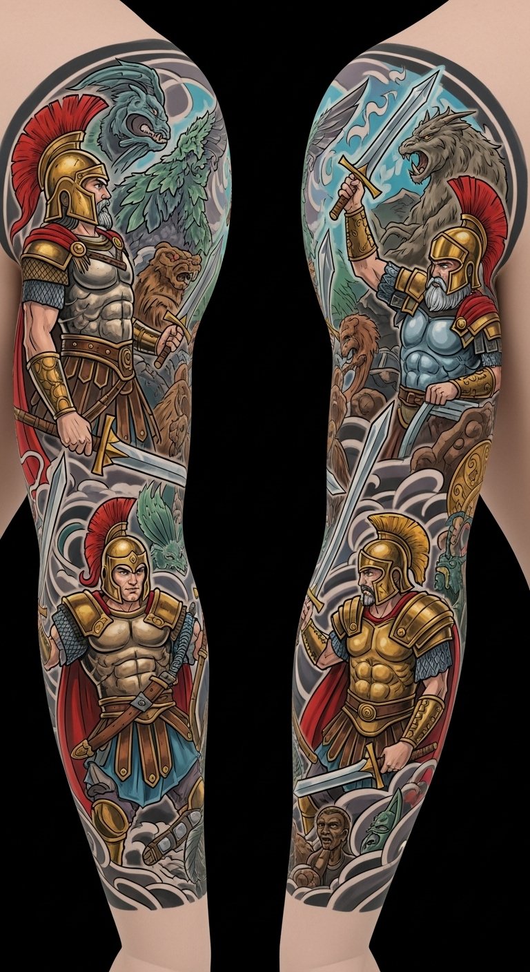 This design concept translates that narrative into a cohesive sleeve: a central heroic figure mid-stride on the upper arm, cloaked in stylized armor, flanked by a serpent-like mythical creature curling down the forearm and a winged companion rising toward the shoulder.