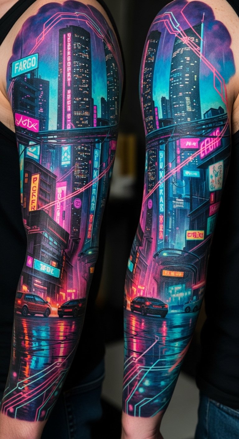 A vibrant cyberpunk cityscape can transform your tattoo sleeve into a stunning tribute to a futuristic world filled with neon lights, towering skyscrapers, and intricate technology.