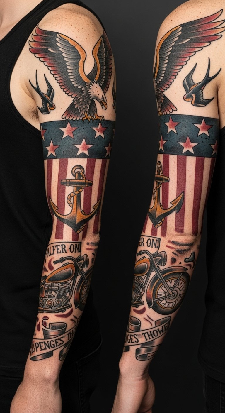 This sleeve places the soaring eagle on the upper arm and shoulder as the focal point of pride and protection, stars and stripes flowing down the bicep to connect to an anchor and swallows at the inner forearm symbolizing steady journeys and safe return; the vintage motorcycle and banner toward the outer forearm evoke adventure and personal motto, while muted colors and distressed shading give a nostalgic, timeless emotion suitable for both bold and intimate placements, creating a cohesive narrative of heritage, freedom, and personal identity.