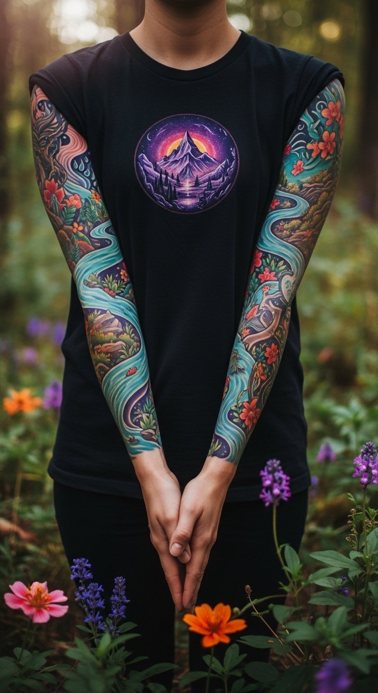 Symbolically this sleeve represents the union of inner and outer worlds—grounding strength from mountains, emotional currents from rivers, and transformative energy from mythical beings—evoking wonder, protection, and creative freedom; ideal placement wraps the shoulder to wrist, with the shoulder/upper arm as the primary focal “mountain” and the inner forearm river guiding the eye toward the wrist.