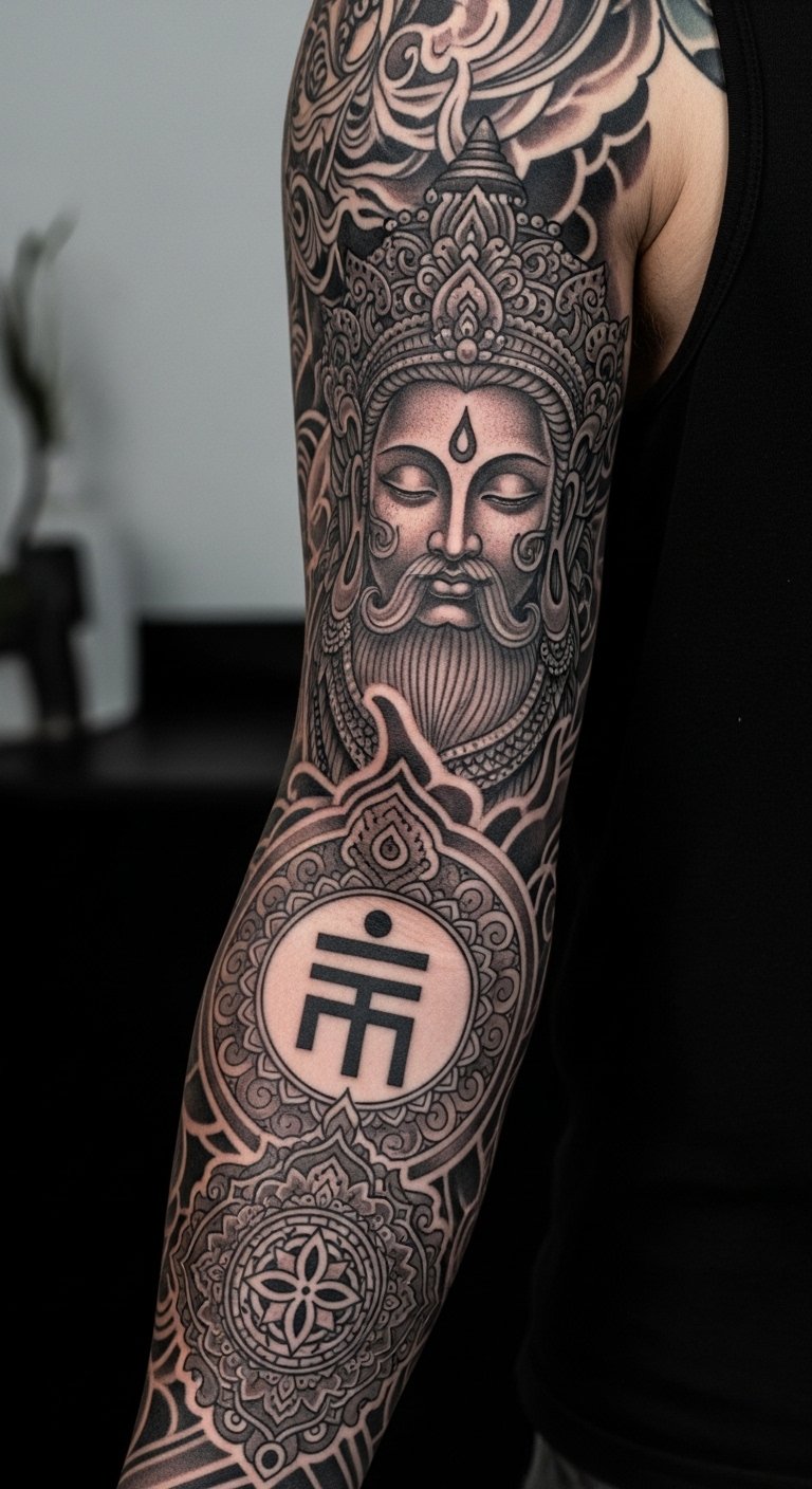 This sleeve concept layers a central, reverent deity figure—rendered in a style that blends fine-line realism and ornamental filigree—with surrounding spirits, sigils, and mythic animals that spiral down the arm.