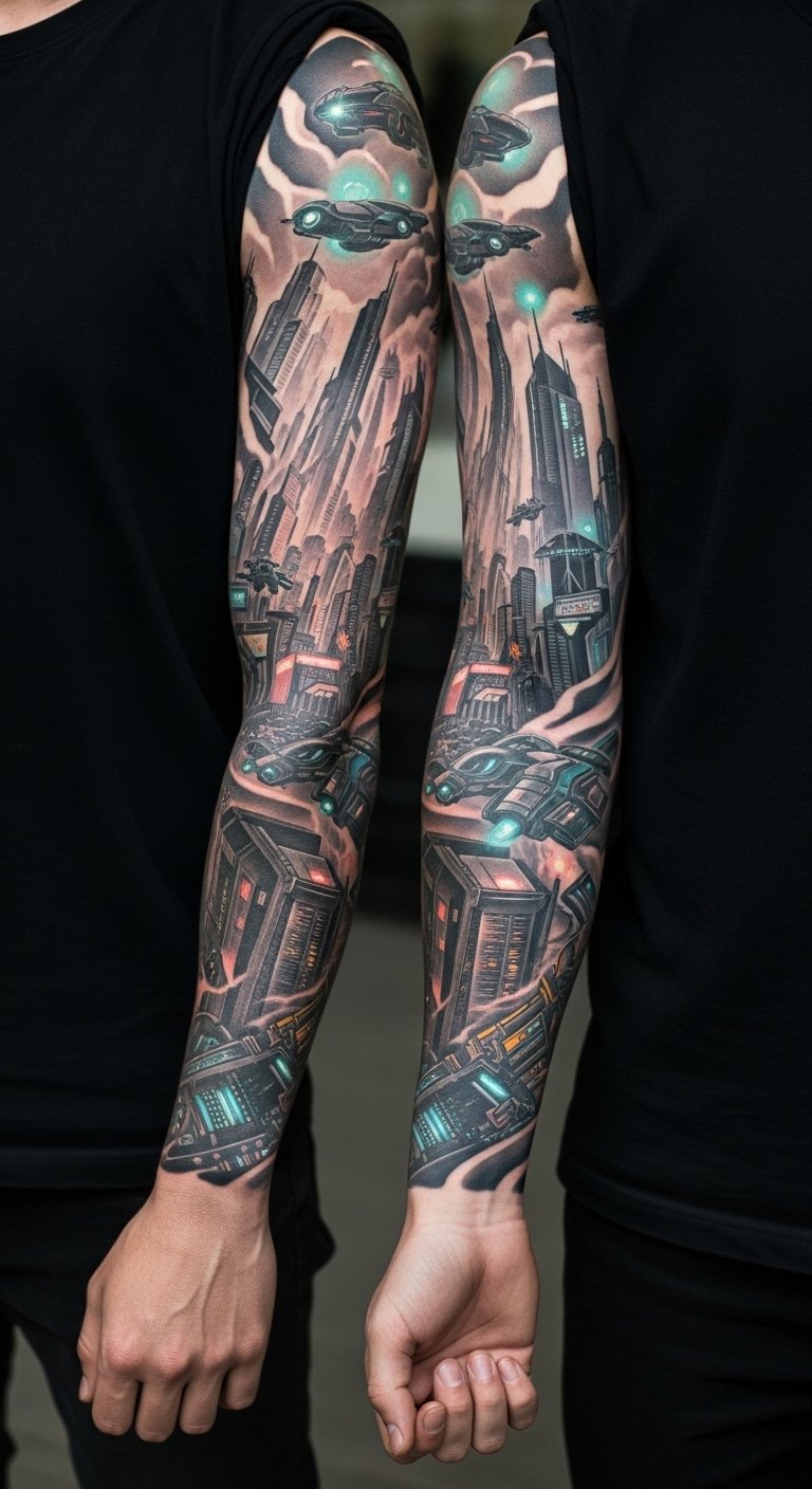 The sleeve symbolizes resilience and individuality amid chaos — neon hues for vitality, rain and reflections for memory and melancholy, and circuit motifs to represent connectivity; it wraps the arm like an urban journey from wrist (ground-level streets, grit) up to shoulder (skyline, possibility), allowing flow with muscle contours and spots for skin highlights to enhance depth.