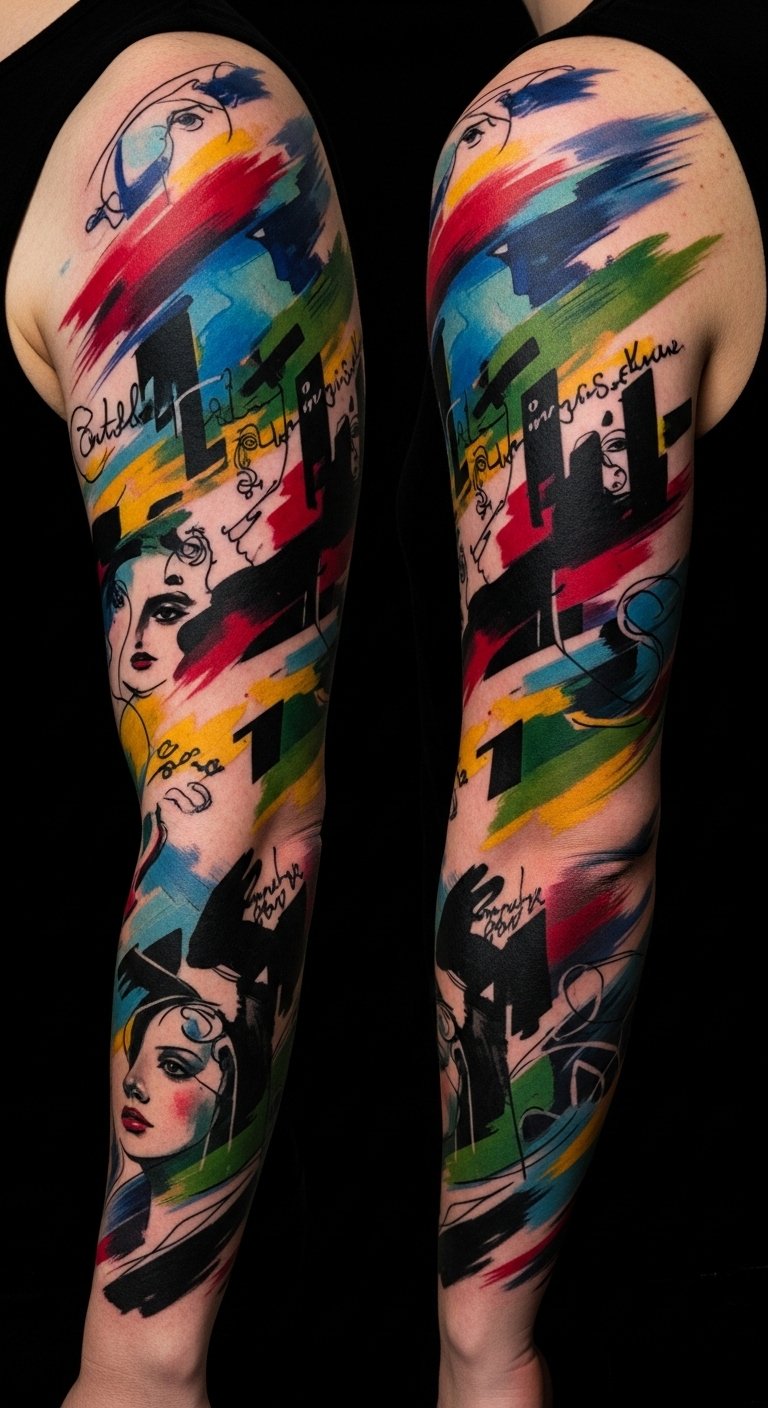 Place the sleeve to flow from shoulder (broad washes of color and primary emotion) down the arm (narrative fragments and tactile gestures) to the wrist (finer script-like marks and resolution), ensuring wrap-around continuity so the piece reads dynamically from every angle.