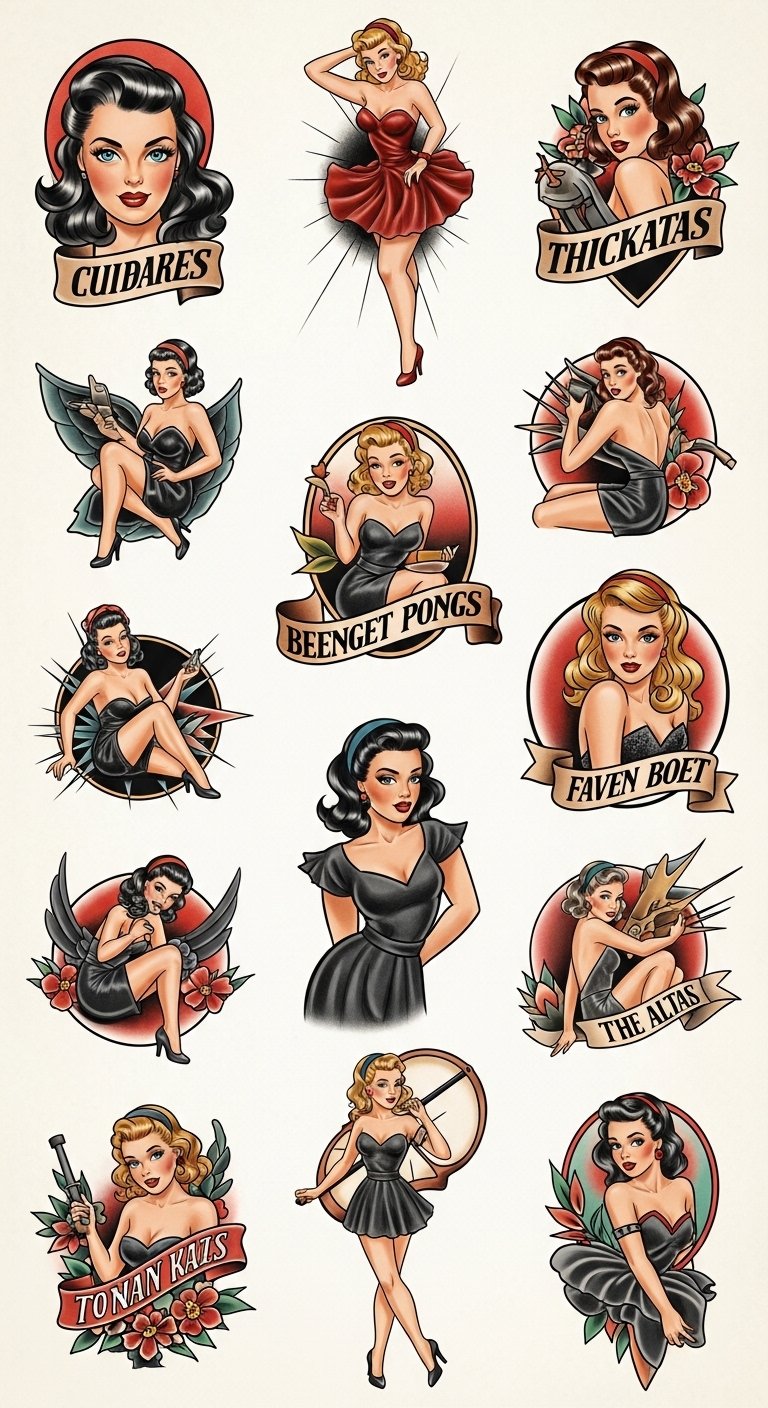 A design concept: a seated playful pin-up in a 1950s sailor dress, bold red and teal palette, soft halftone shading, glossy highlights, small anchor and rose motifs integrated into background ribbon, subtle tattooed script reading “freedom” along the forearm; overall size suited for upper arm or thigh. This piece symbolizes nostalgia meeting personal empowerment, evoking warm sentimentality and confident femininity; place on the upper arm, thigh, or shoulder blade to allow visibility or concealment depending on mood, creating an intimate emotional statement that balances vintage charm with modern self-expression.