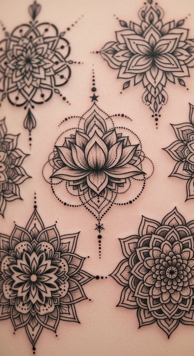 This design concept centers on a layered mandala radiating from a small lotus at its core, expanding through concentric circles of filigree, dotwork, and geometric lace that echoes the original text’s celebration of symmetry and spirituality. Symbolically, the lotus core represents personal awakening and resilience, the balanced concentric patterns signify inner harmony and the journey toward self-realization, and the open, flowing filigree evokes freedom and self-expression. Emotionally the piece is meant to feel meditative and empowering—calming in its symmetry yet bold in its detail. Ideal placement is the upper back or sternum where the radial layout can align with the body’s centerline, or scaled down for the forearm or calf to maintain clarity of linework.