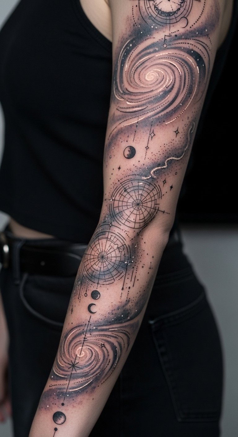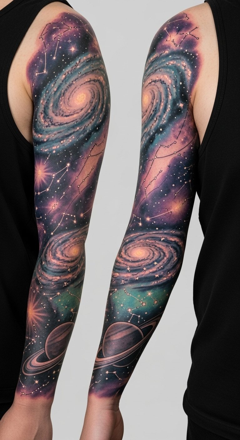 Best placed as a full sleeve flowing from shoulder to wrist, the composition should follow natural muscle lines so galaxies wrap and move with the arm, with focal elements (a bright nebula or constellation) positioned on the outer bicep or forearm for visual impact and personal resonance.