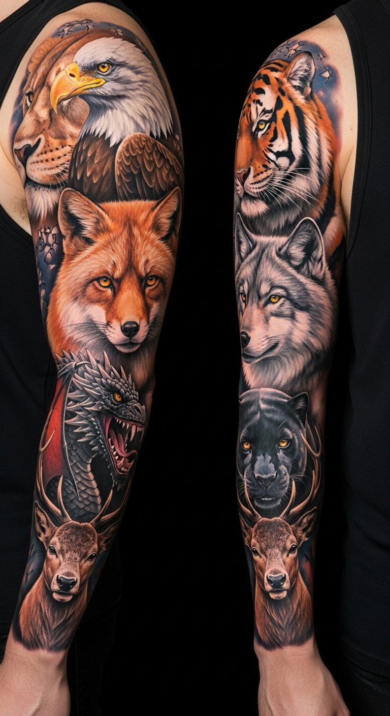 Emotionally bold and empowering, the piece works as a flowing sleeve or upper-arm wrap where each animal transitions into the next through dynamic linework and contrasting textures, allowing personal selection and placement to reflect the wearer’s inner instincts and life story.
