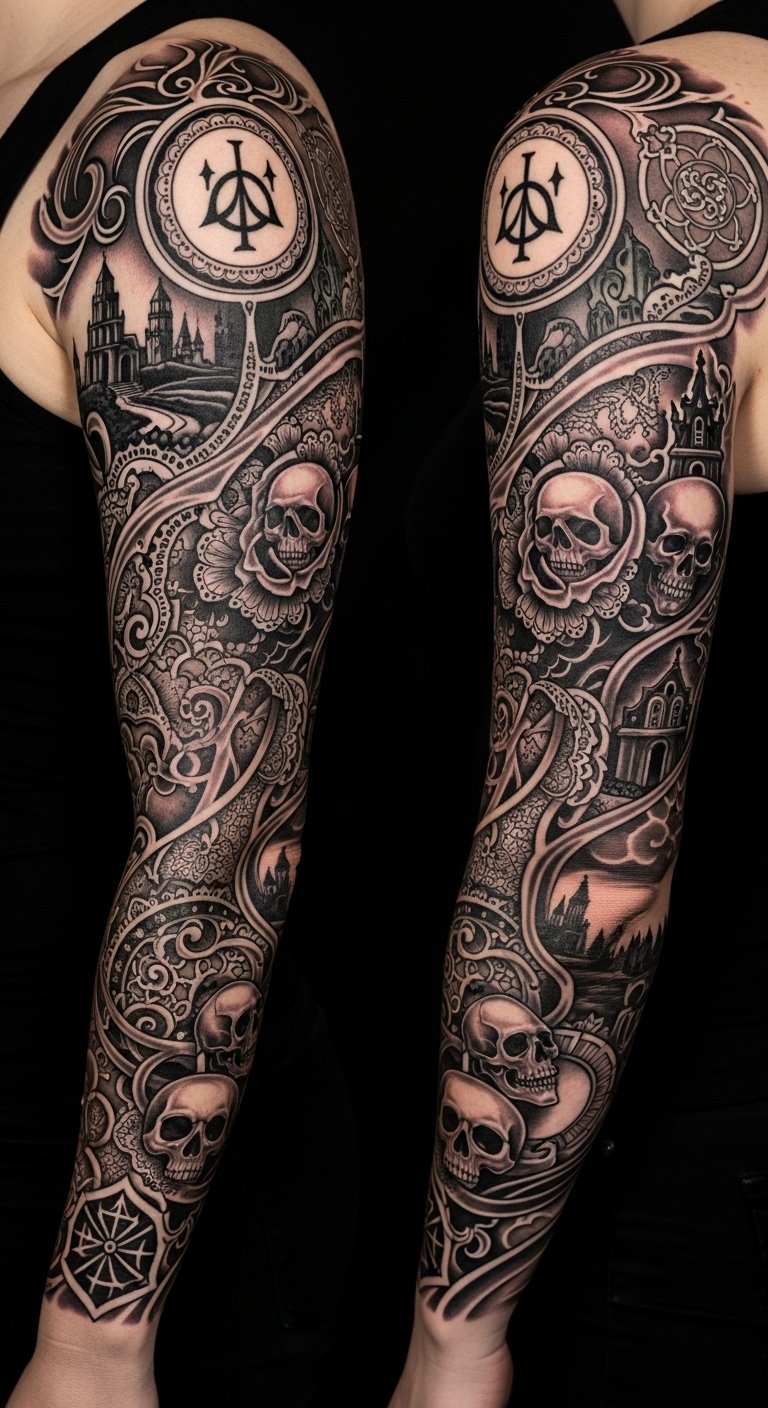 This sleeve design weaves ornate lace and Victorian filigree around aged skulls, shadowed spires, and fog-draped manor silhouettes to evoke melancholic romanticism; small symbols—clock hands frozen at midnight, wilted roses, raven feathers—add personal meaning and a sense of time suspended.