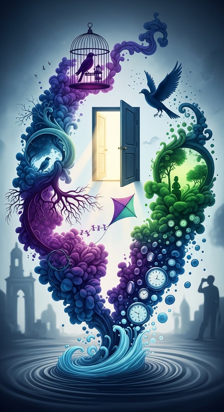 Symbolically this piece maps the subconscious: melting time suggests fluid memory, fragmented faces show multiple selves, keyholes and doors imply access and choice, birds and open palms symbolize yearning for freedom.