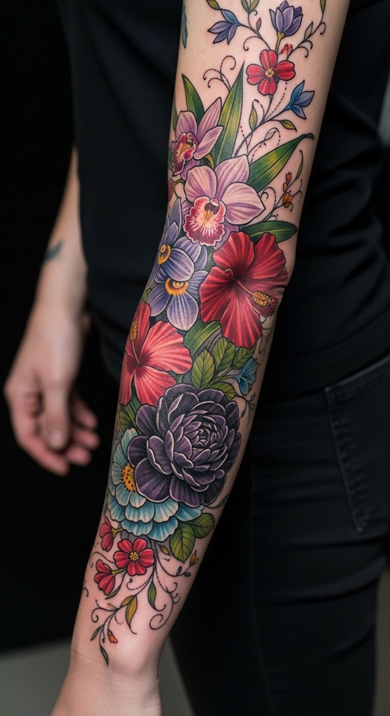 Symbolically it represents growth, resilience, and individuality—the vintage roses for timeless grace, orchids for rarity and strength, wildflowers for spontaneity. Emotionally it evokes freedom and confidence, suitable for a forearm sleeve, shoulder-to-chest transition, or a large back panel where curves can follow muscle lines and allow delicate details to breathe.