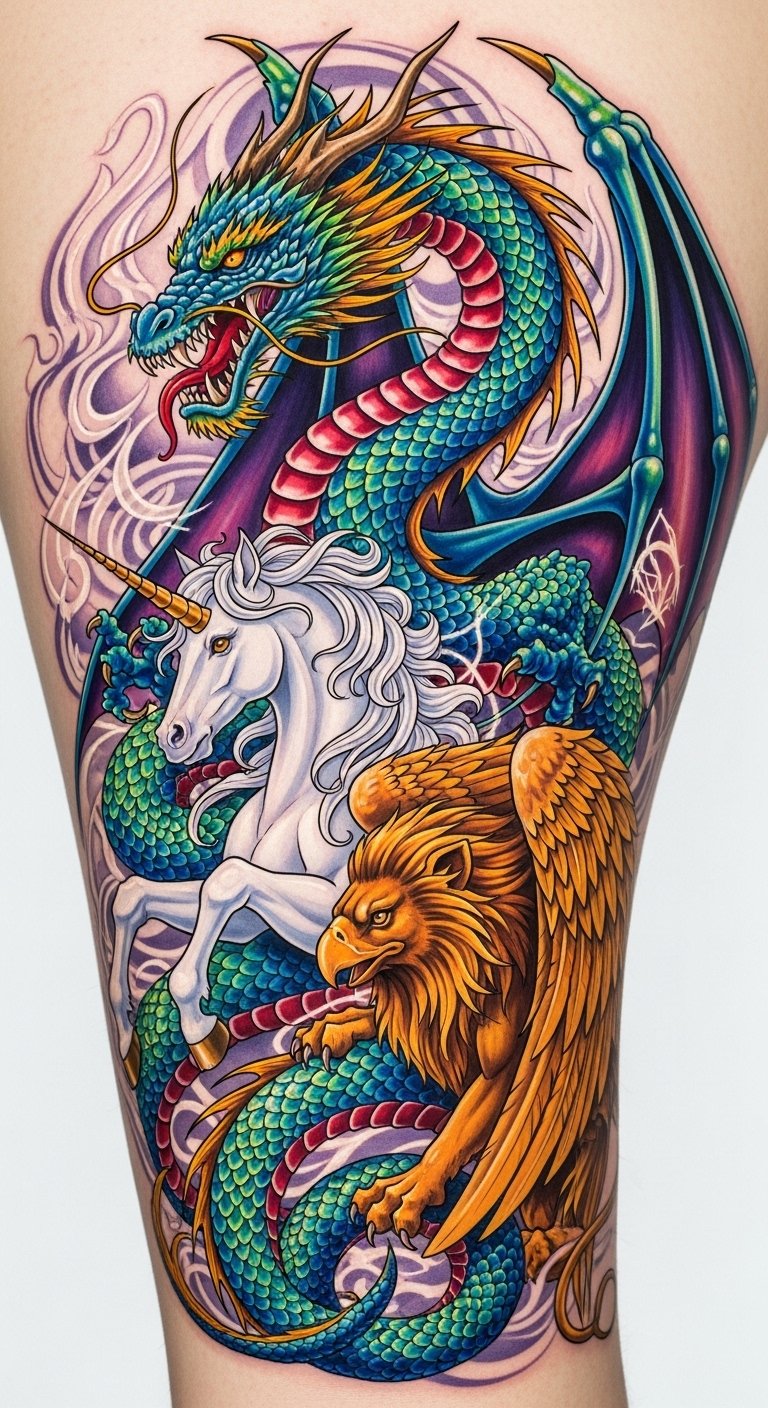 This tattoo concept blends the original imagery into a cohesive sleeve or back piece: a central fierce dragon with iridescent scales coils dynamically around a graceful unicorn and a stoic griffin, their forms interlaced to suggest unity between power, purity, and guardianship. Symbolically it represents inner strength (dragon), innocence and hope (unicorn), and protection or loyalty (griffin), evoking wonder and adventurous spirit. Emotionally the composition inspires courage and freedom; ideal placements are the upper arm wrapping into the shoulder, a full-back mural, or a thigh panel where the flowing lines can follow musculature and movement.