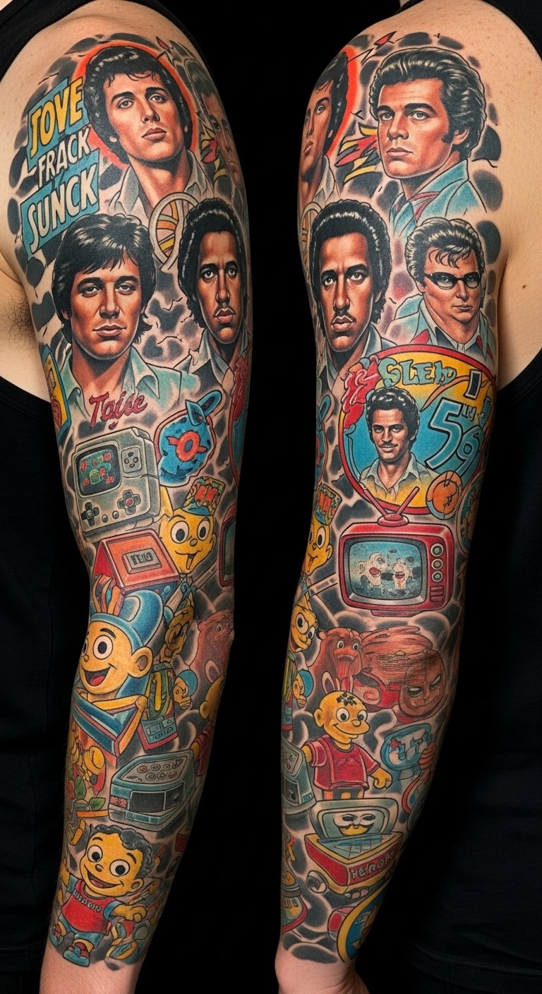 The emotional tone is warm, nostalgic, and celebratory, designed to spark recognition and conversation. Placement as a full sleeve allows layered storytelling, with larger central pieces on the upper arm and shoulder and smaller, detailed icons and quotes wrapping the forearm and wrist for intimate viewing.