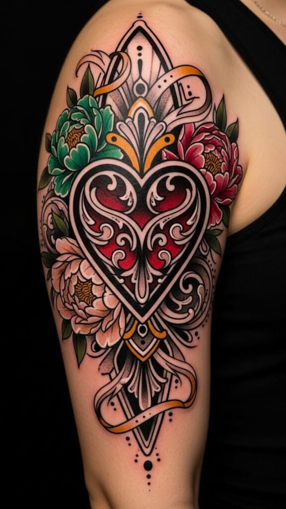 This design uses the ornate heart as a symbol of passion and personal truth, peonies for prosperity and protection, and scrollwork to suggest continuity and heritage; jewel tones evoke depth and confidence while cream highlights soften intensity, creating a balance of strength and tenderness.