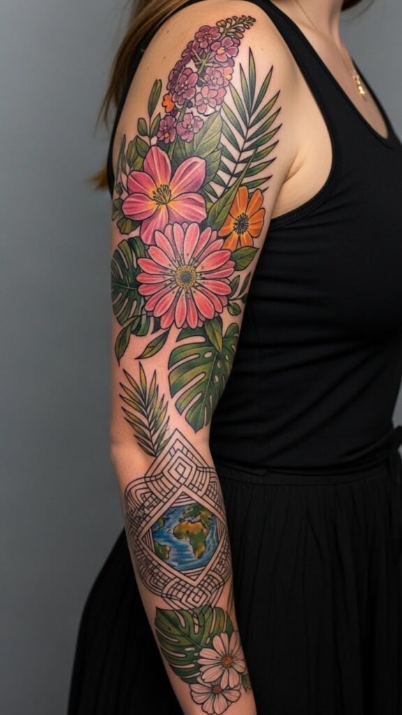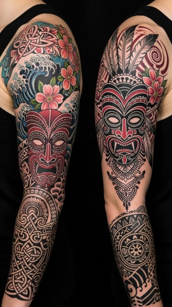 This design concept blends the listed cultural elements into a cohesive sleeve that honors ancestry and personal journey; the combination of flowing botanical forms with geometric knots, bold tribal motifs, and delicate henna filigree creates a balance of strength and grace. Emotionally it conveys reverence, resilience, and connection—each symbol chosen for its story, placed to follow muscle contours so the imagery moves with the body: Celtic knots around the bicep, Maori patterns wrapping the forearm, Japanese waves and Aztec bands interweaving toward the wrist, and small Native American, Persian, Nordic, and African accents filling transitions and negative space.