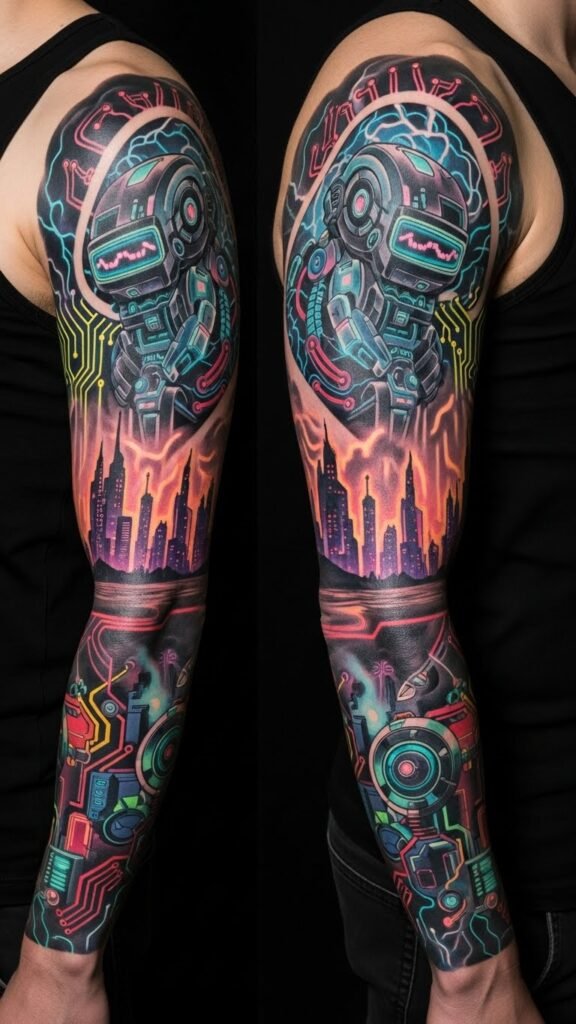 Ideal placement is a full arm sleeve from shoulder to wrist, wrapping slightly onto chest and upper back for cityscape horizons, with key focal points (elbow, outer bicep, forearm) reserved for the most detailed cybernetic enhancements so they animate with movement.
