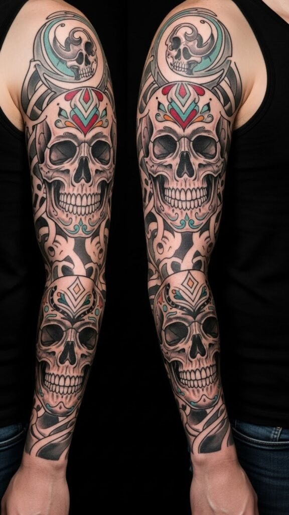 This sleeve concept centers a series of stylized skulls flowing from shoulder to wrist, each skull embellished with vibrant color palettes and intricate patterns—floral filigree, geometric inlays, and touches of watercolor wash—to convey resilience and life emerging from mortality.