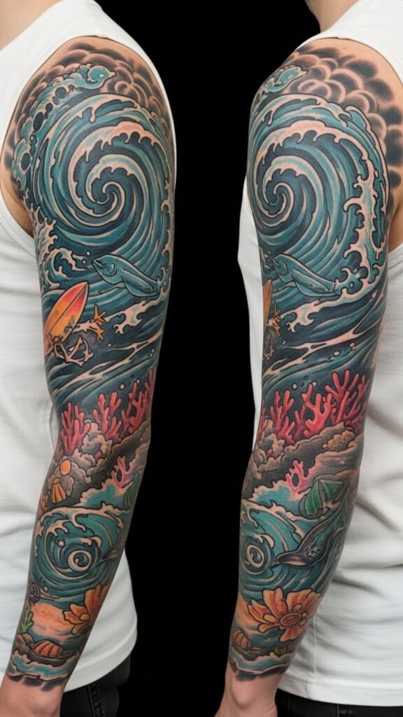 Nautical symbols (anchors, compasses) add guidance and stability, and coastal flora softens transitions between elements for a cohesive flow. Best suited as a full or half sleeve that wraps from shoulder to forearm, the composition follows arm contours so waves and creatures appear to move with the wearer’s motion, evoking calm and adventurous emotions.