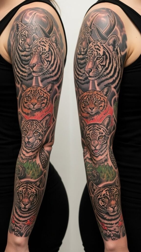 Place the sleeve to flow with muscles and natural contours—shoulder cap to wrist—for movement and storytelling; emotionally, it suggests curiosity, resilience, and quiet reverence for the wild.