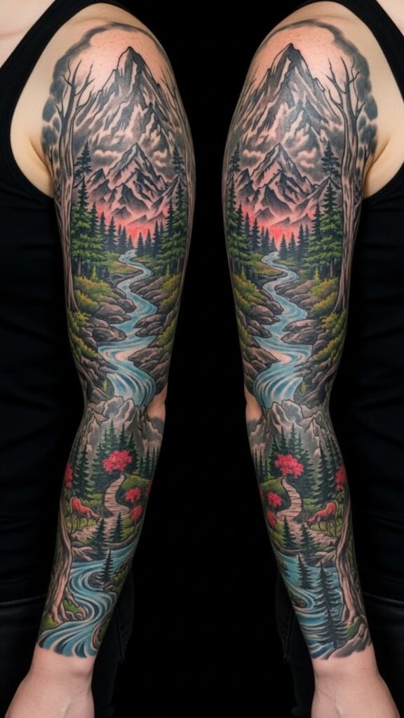 Ideal placement is a full arm sleeve wrapping from shoulder to wrist so elements flow with muscle contours—mountains on the upper arm, trees along the bicep and inner arm, rivers curving toward the wrist—allowing detailed shading, subtle color for seasons, and room for wildlife silhouettes to evoke connection to the outdoors.