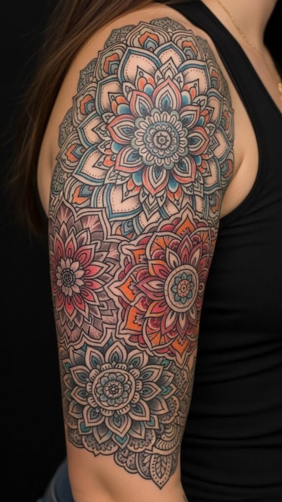 As you explore the world of mandala patterns, you’ll find an enchanting blend of symmetry, spirituality, and personal expression that transforms your tattoo sleeve into a mesmerizing work of art. Each mandala features intricate designs and geometric shapes, reflecting personal meanings and cultural influences. The spiritual significance of these patterns, combined with vibrant color variations, can enhance mindfulness practices and elevate your tattoo placement to new heights. This design centers a large, radial mandala on the upper arm, cascading smaller, interlocking mandalas down the forearm to create flow; fine line geometry conveys precision and calm, while selective use of deep indigo, gold, and soft teal accentuates focal points and chakral references. Symbolically, the concentric layers represent inner journey, balance, and protection; emotionally it evokes serenity and focus; placement along the sleeve allows both concealment and display, making it ideal for someone seeking a wearable meditation and a personal narrative on the skin.