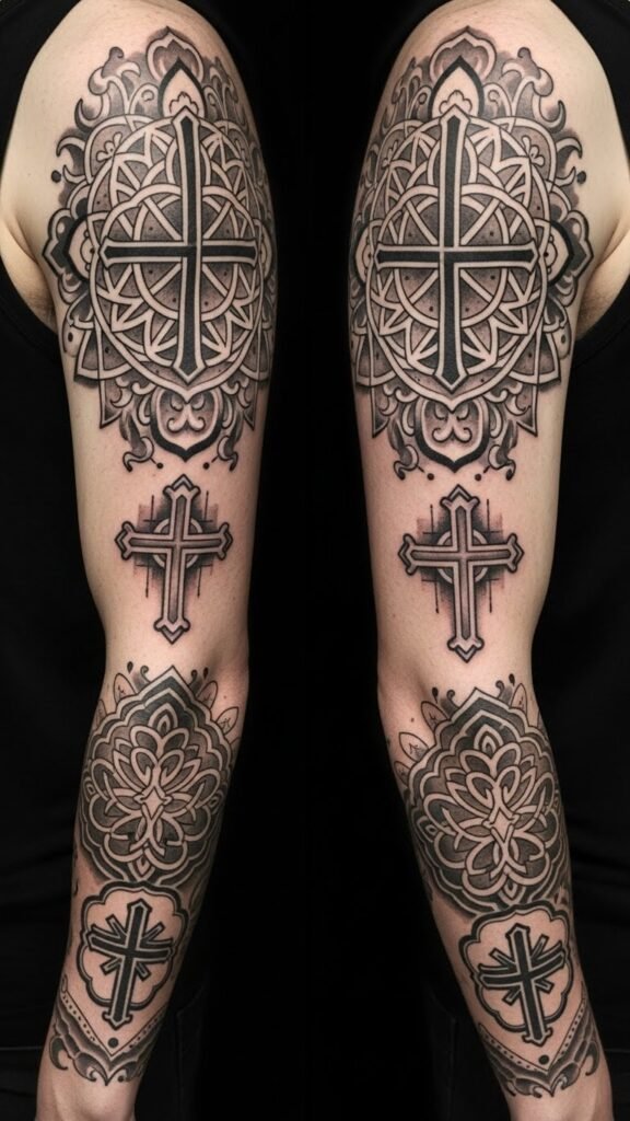 Design a full sleeve that layers sacred geometry — interlocking circles, Metatron’s cube, and a golden ratio spiral — as a unifying lattice for distinct religious symbols chosen by the wearer, rendered in fine-line blackwork with selective gold and muted color accents. Place a central mandala at the shoulder to anchor the composition, a vertically aligned set of symbols down the inner forearm for intimate viewing, and a larger, more ornate emblem on the outer bicep for public display. This composition communicates devotion and personal history: the geometry represents cosmic order and continuity, each symbol marks a chapter of belief and transformation, and the contrast between crisp linework and soft color evokes reverence, calm, and a contemplative journey.