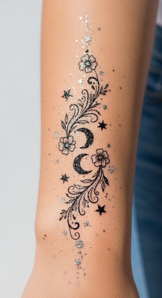 The design’s stars and moons symbolize hope, guidance, and inner light, while filigree vines and flowers evoke growth and playful femininity; placed on the wrist or shoulder it reads as a confident accent, on the ankle as a secret flourish—overall the tattoo conveys joy, self-expression, and a touch of nostalgic sparkle.
